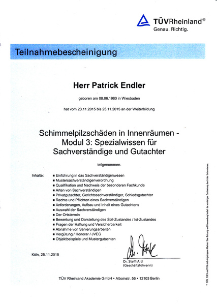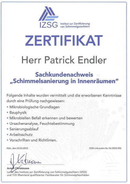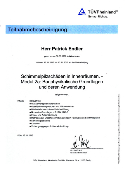 Der Besichtigungstermin wird auf maximal eine Stunde veranschlagt, in welcher ich Ihre Fragen beantworte und Möglichkeiten der fachgerechten Sanierung aufzeige.